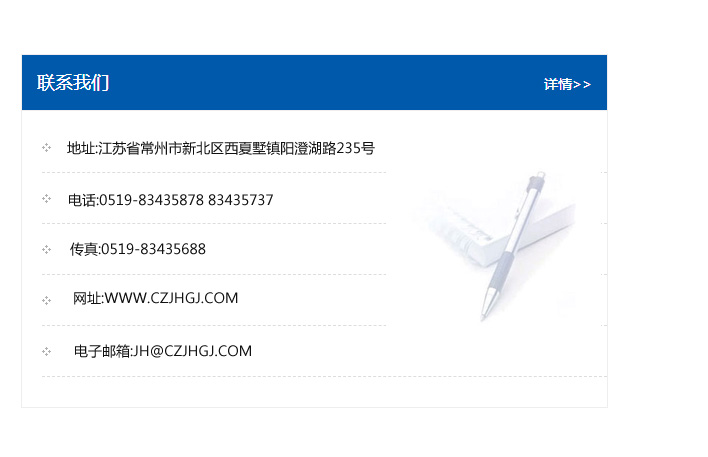 地址:常州市新北區友邦商務大廈1幢16、17層  電話:0519-85101652  傳真:0519-85112595  郵編:213022  網址:www_cz-jiayue_cn.kmyhzs.com  郵箱:xiajifengaa@163.com